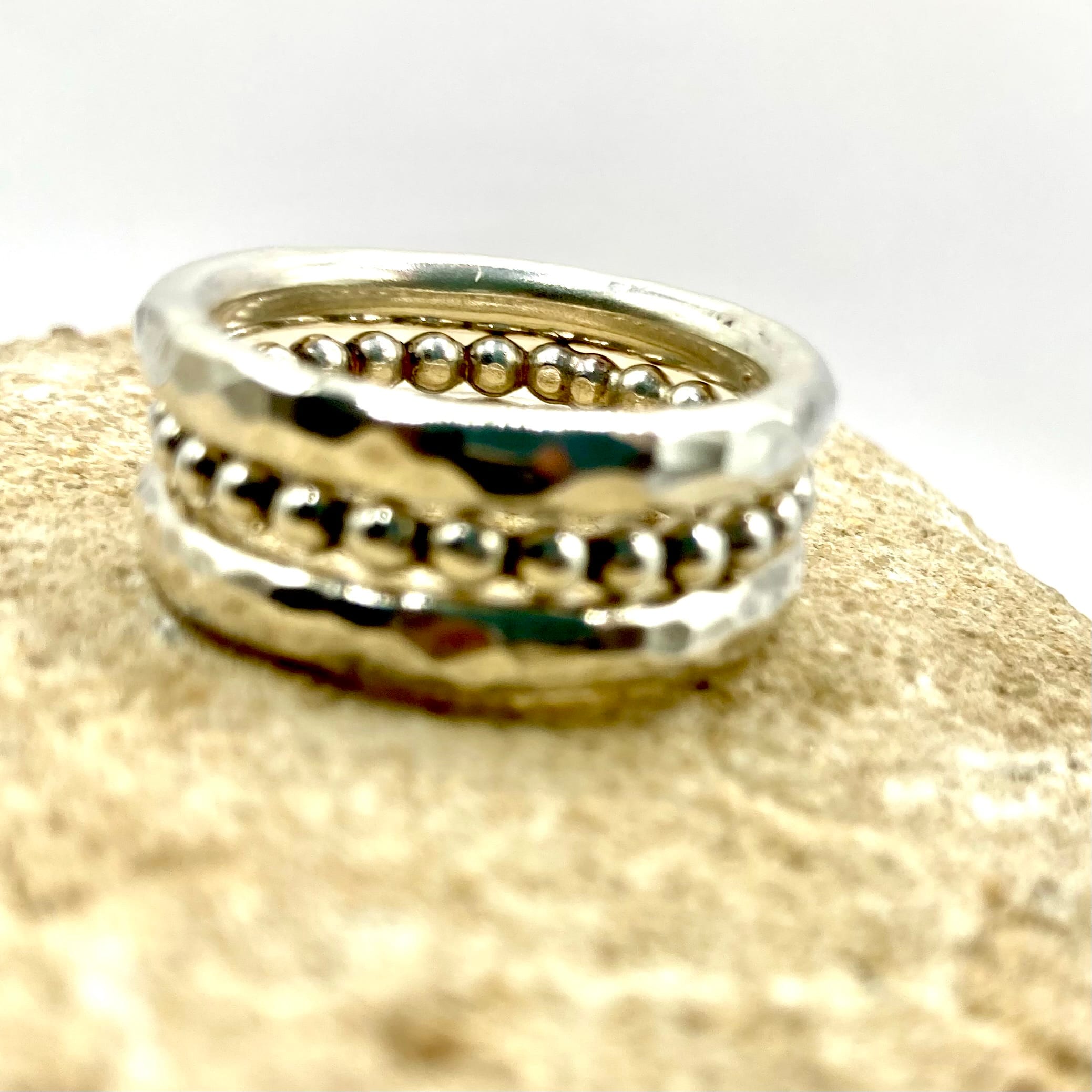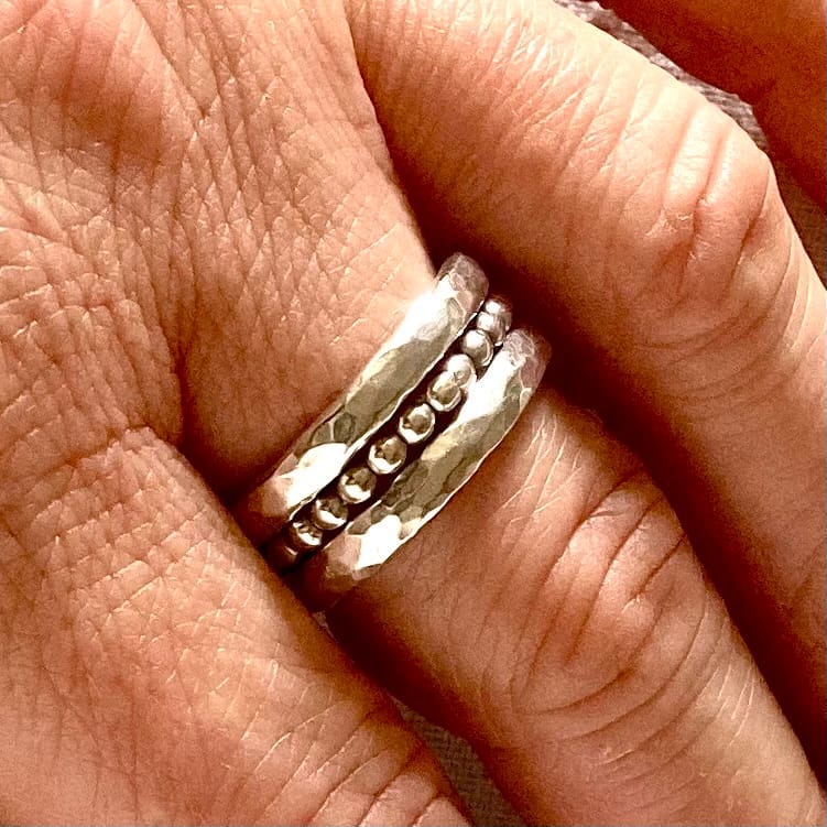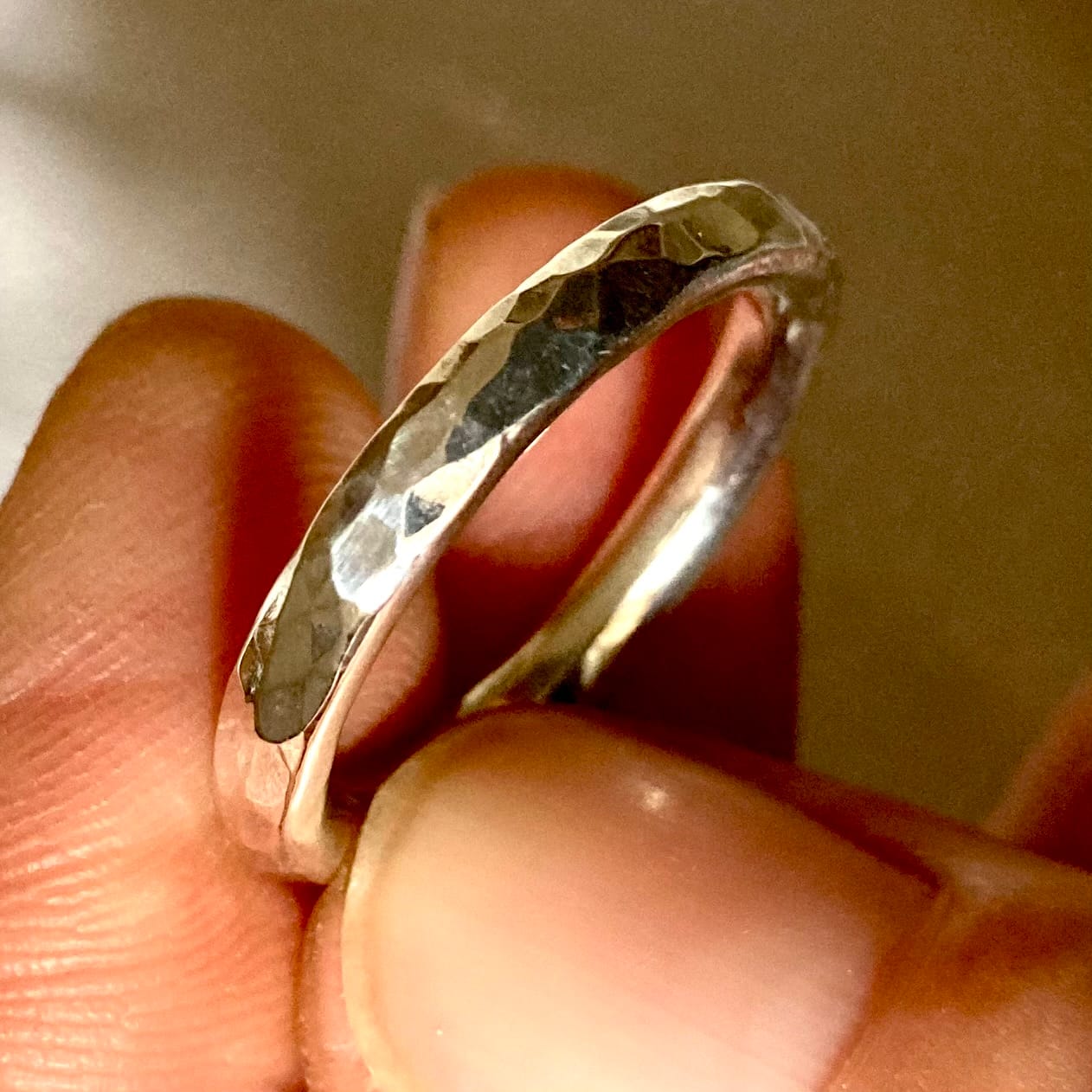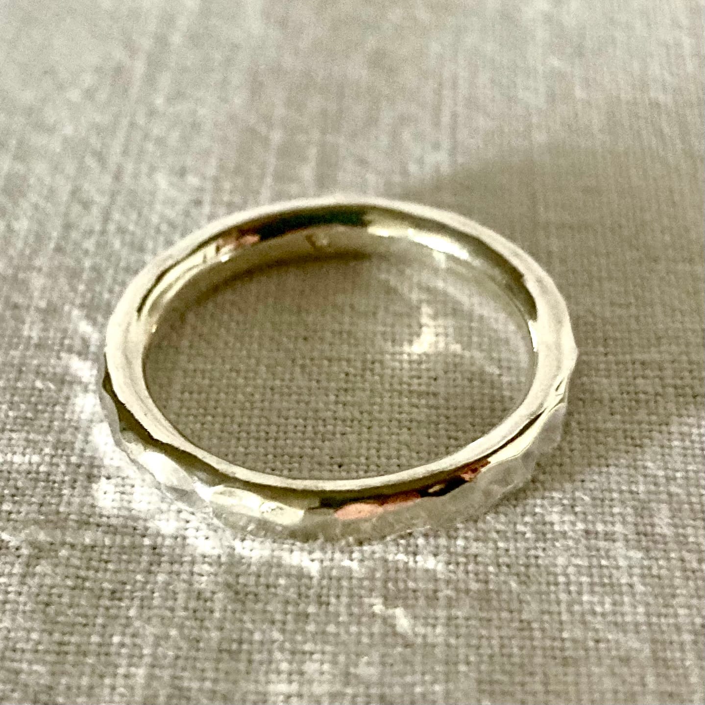 Chaque bague est unique : les marques du martelage ne sont jamais identiques, comme une empreinte digitale. C’est la promesse d’un bijou fait main qui a une âme.