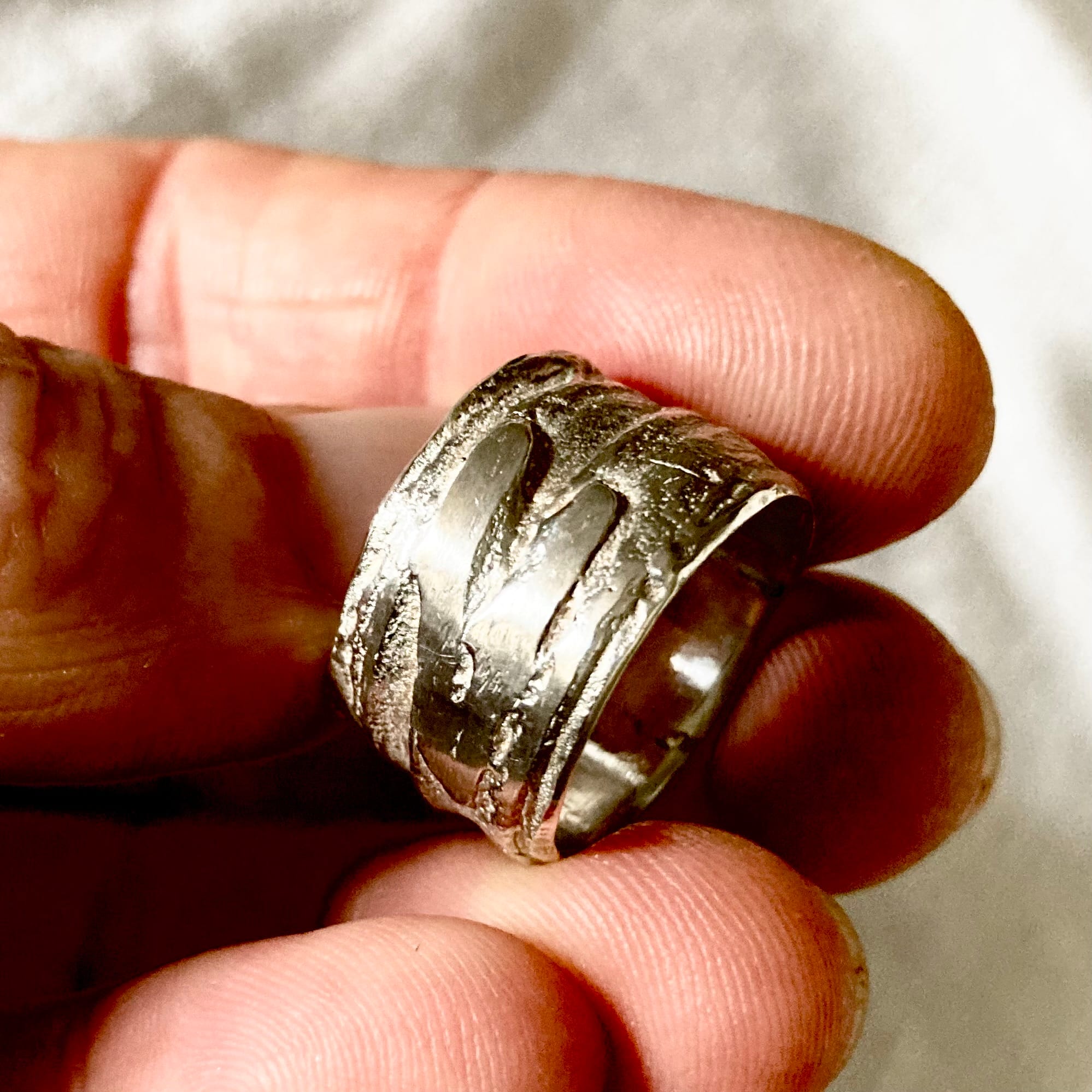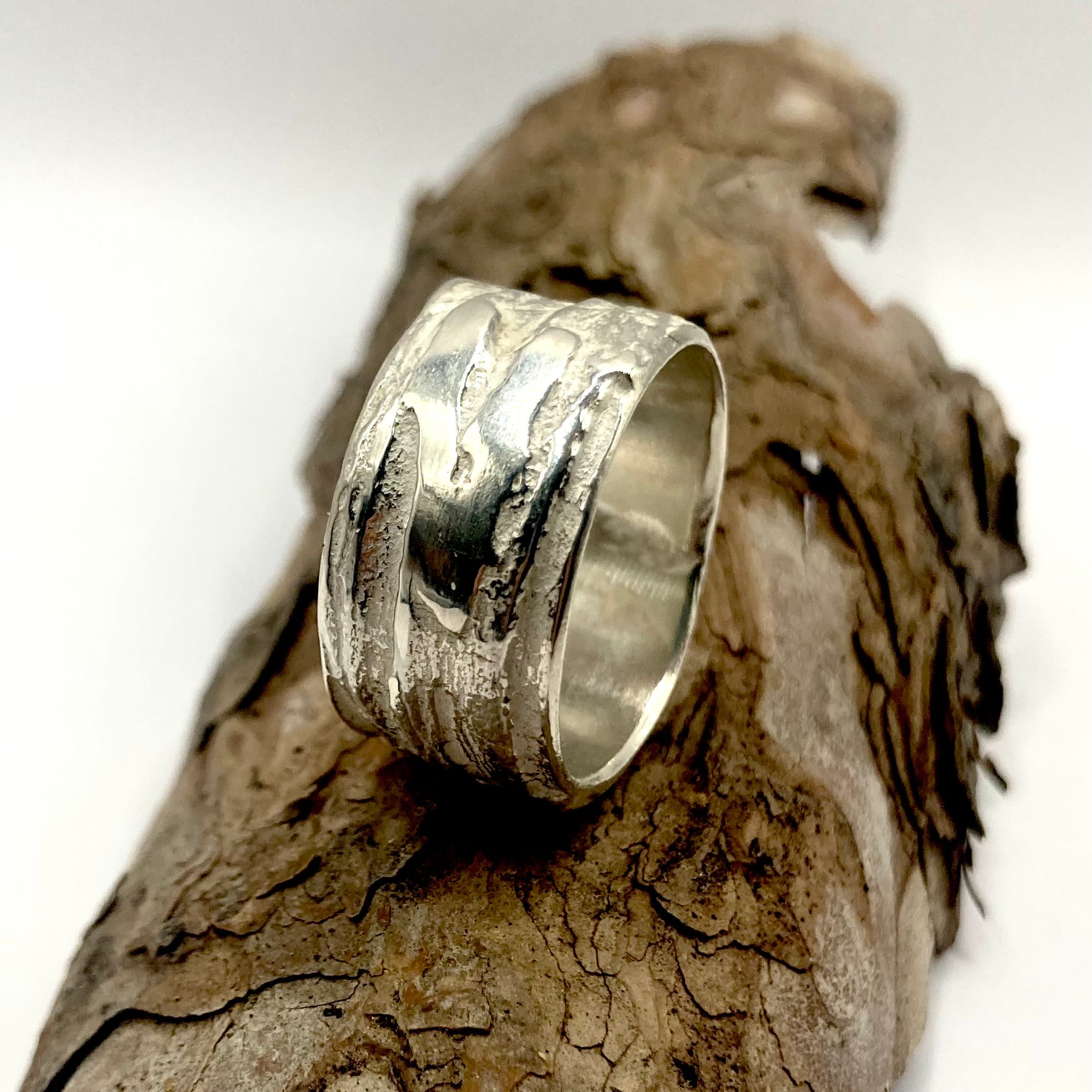 Chaque bague est créée dans mon atelier, selon un savoir-faire traditionnel : la fonte à la cire perdue. Cette technique ancestrale permet de reproduire fidèlement la texture brute de l’écorce. L’extérieur de la bague conserve son aspect naturel, tandis que le cœur est poli miroir pour refléter la lumière.