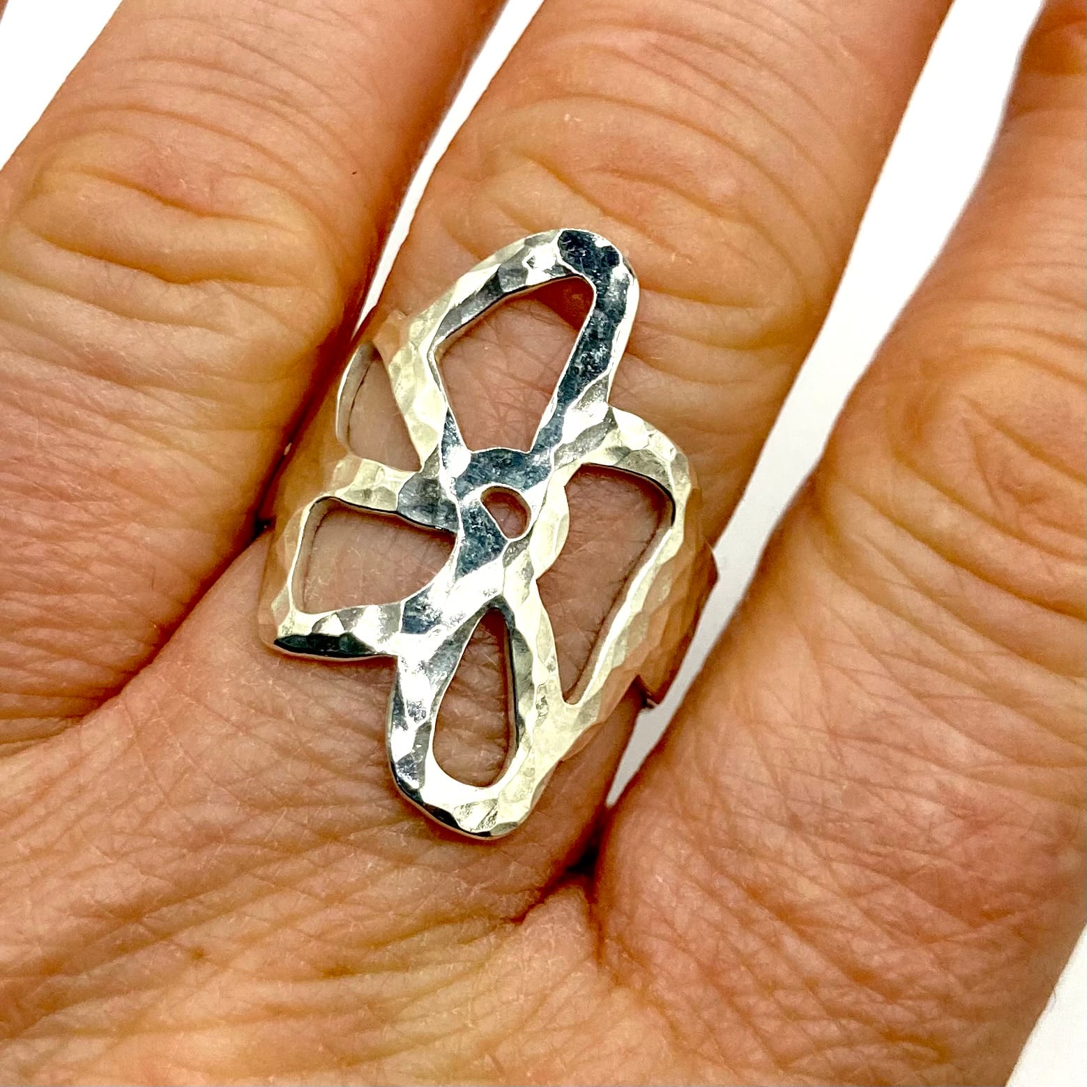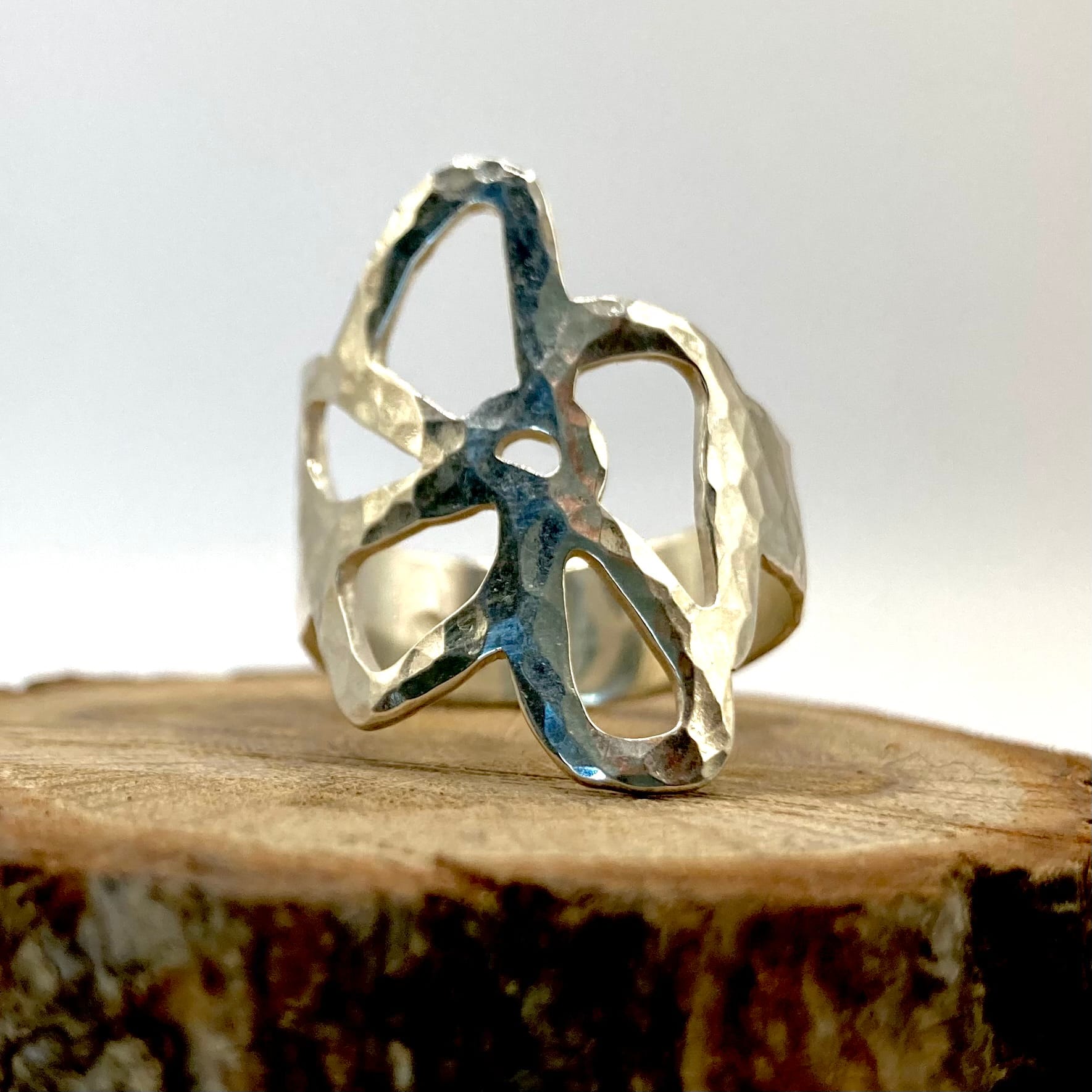Bague argent 925 artisanale “Fleur”, martelée évidée. Bijou nature unique, durable et poétique, fabriqué à la main en France.