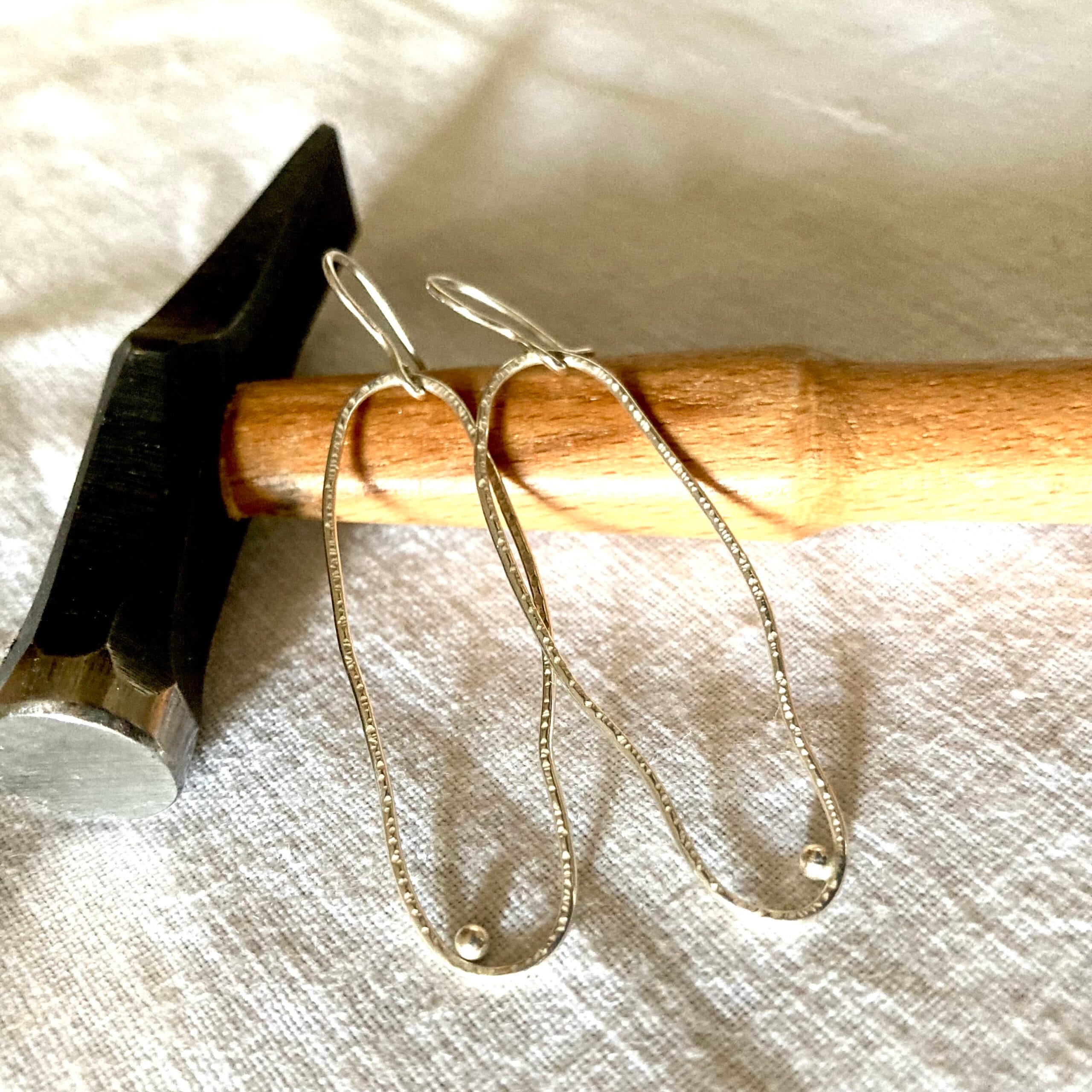 Chaque paire est réalisée dans mon atelier, en argent 925 recyclé. Le cercle, formé à partir d’un fil d’argent, est martelé à la main pour capter la lumière différemment selon l’angle. Au centre, un petit grain d’argent poli vient contraster avec le cercle texturé.