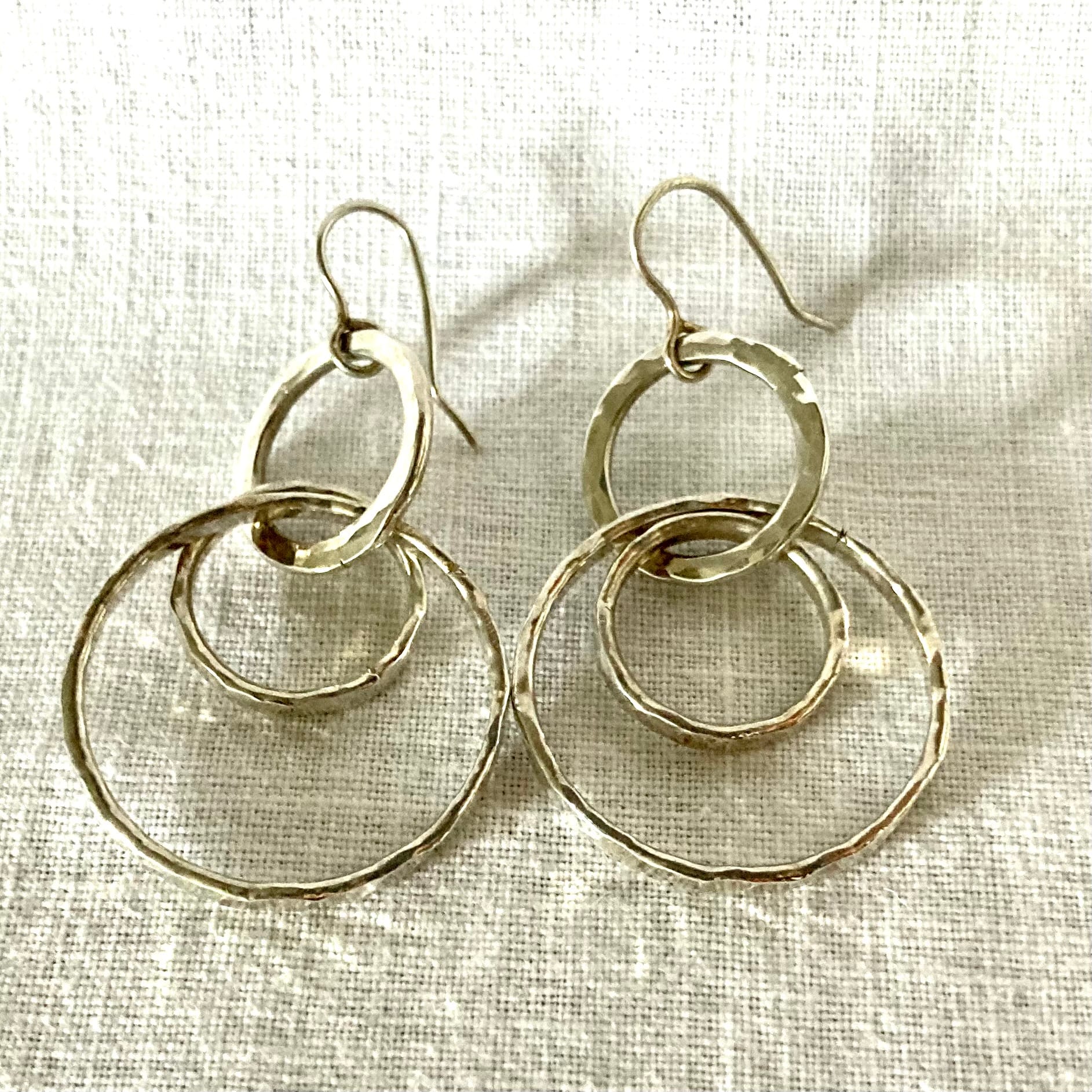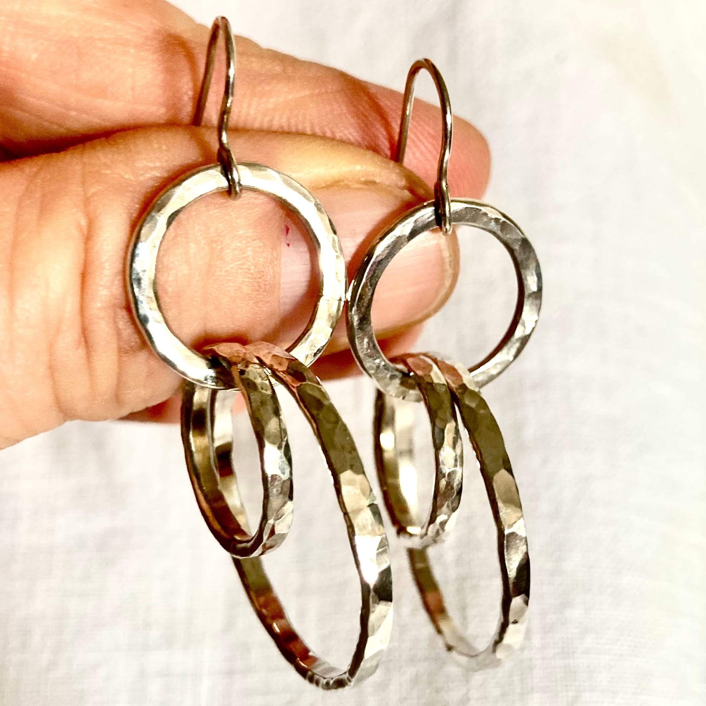 Ces boucles d’oreilles sont entièrement réalisées à la main dans mon atelier. Chaque anneau est façonné à partir de fil d’argent recyclé, puis martelé avec patience pour révéler ses reflets multiples. L’entrelacement des anneaux crée une harmonie organique, où chaque coup de marteau devient une empreinte vivante du geste artisanal.
