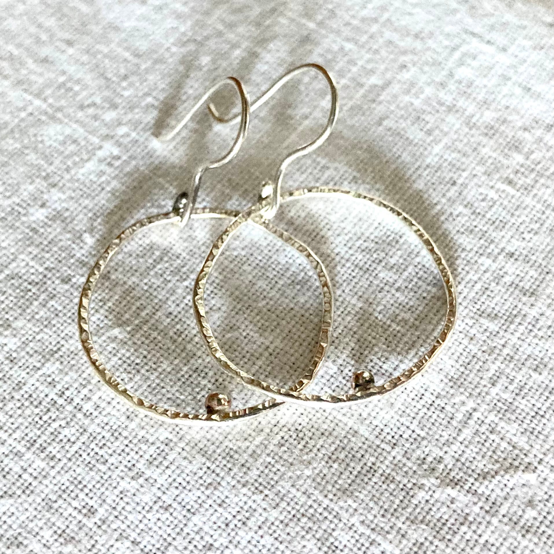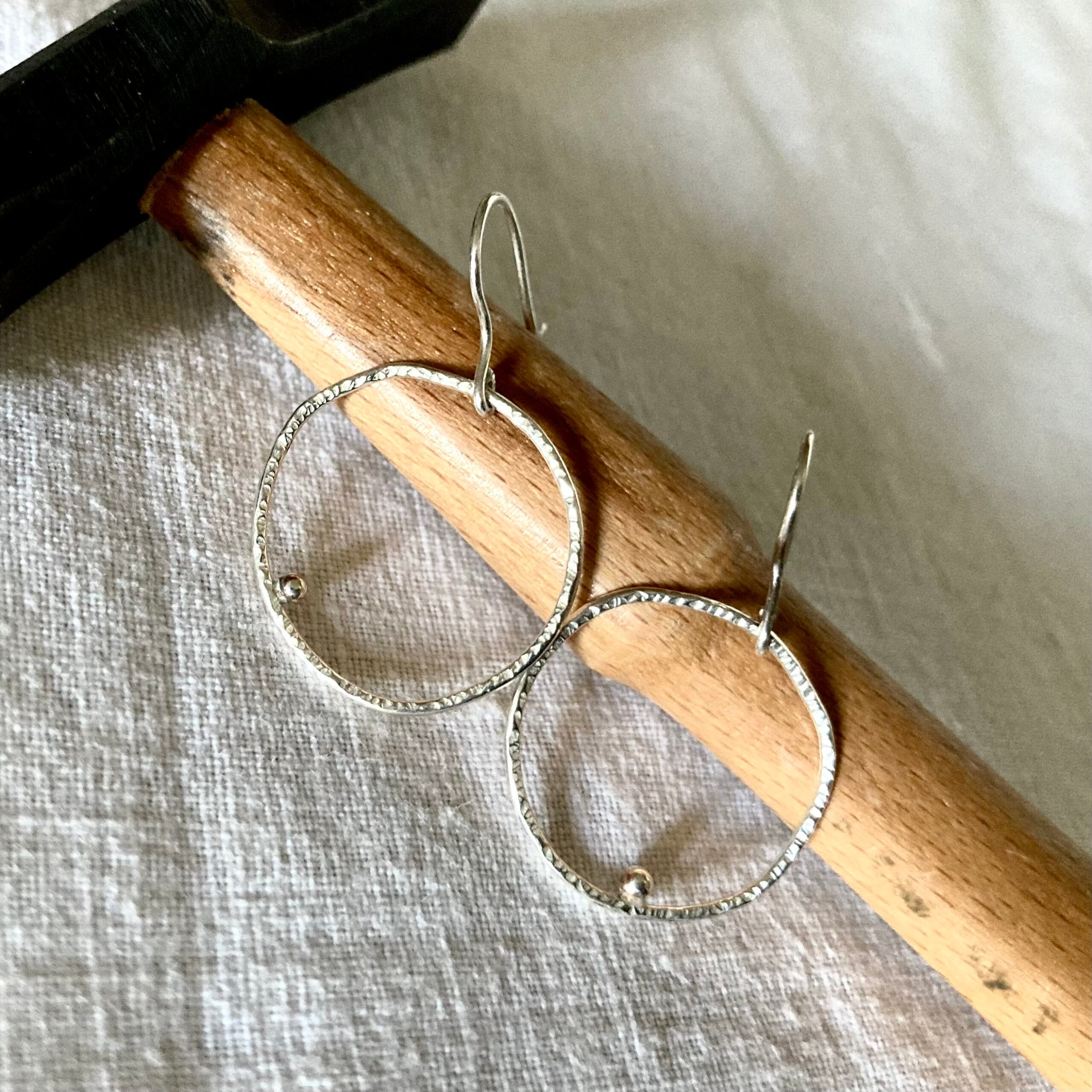 Boucles d’oreilles argent 925 artisanales « Un Grain sur le Fil ». Cercle martelé et grain poli suspendu, alliance de textures et de lumière. Une création unique de la Collection Texture, inspirée par la nature.