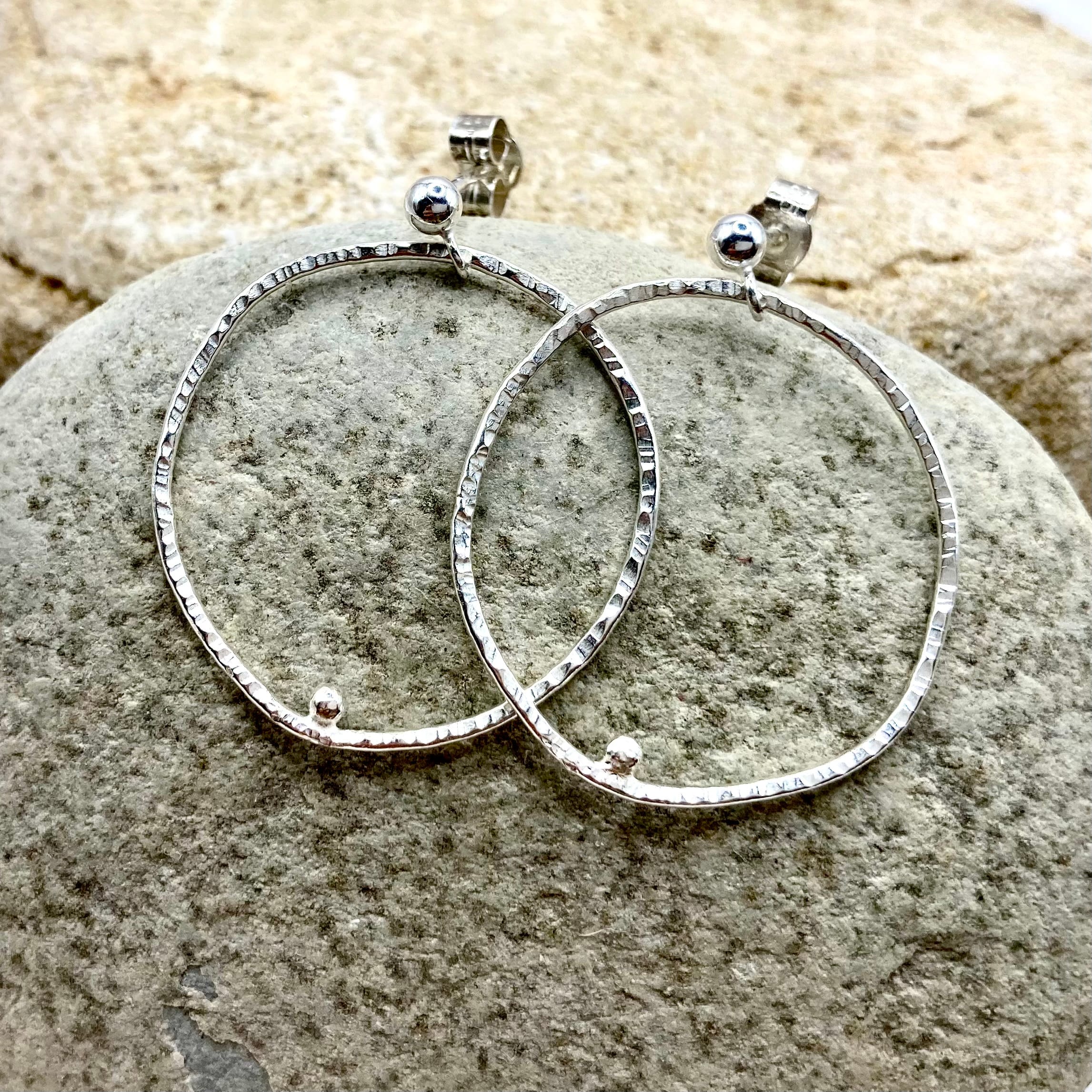 Boucles d’oreilles argent 925 artisanales « Un Grain sur le Fil ». Cercle martelé et grain poli suspendu, alliance de textures et de lumière. Une création unique de la Collection Texture, inspirée par la nature.