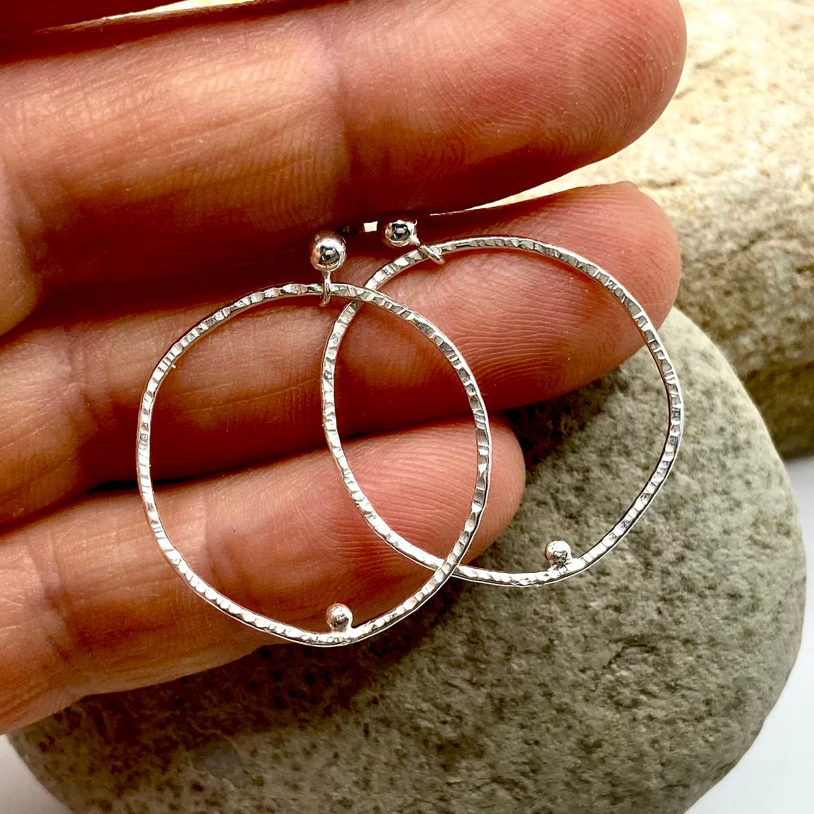 Chaque paire est réalisée dans mon atelier, en argent 925 recyclé. Le cercle, formé à partir d’un fil d’argent, est martelé à la main pour capter la lumière différemment selon l’angle. Au centre, un petit grain d’argent poli vient contraster avec le cercle texturé.