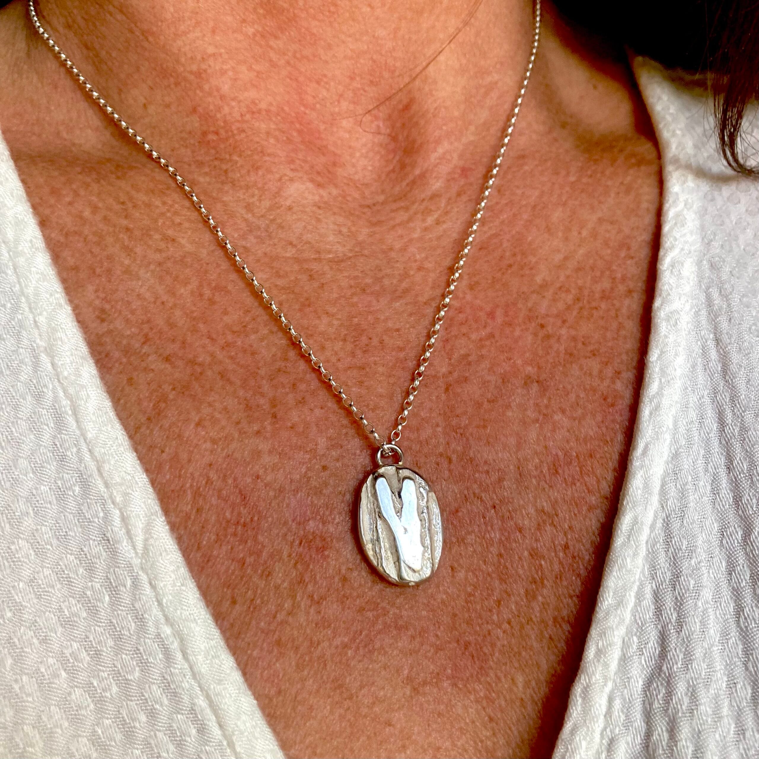 Pendentif argent 925 artisanal “Cyprès du Coeur”. Empreinte d’écorce de cyprès. Contraste subtil entre l’éclat et la matière. Une création unique de la collection Nature.